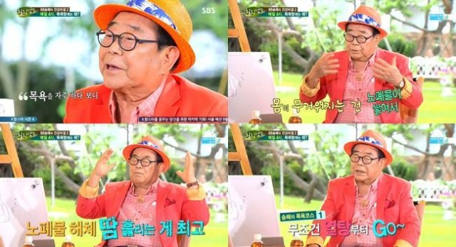 송해는 우리나라에서 대표적인 장수 연예인으로 송해의 장수비결은 한결같이 지하철 등 대중교통을 이용하고 가까운 거리는 반드시 걷는다고 합니다. 매일 오후 4~5시경이면 인근 목욕탕을 찾는 경우가 많고, 탕속에서는 부지런히 다리와 팔 등 몸을 움직여 운동효과를 낸다고 합니다.