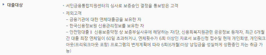 다만 금융기관에 대한 연체대출금을 보유하고 계신 분 및 한국 신용정보원 신용관리정보를 보유한분, 안전망대출 신용보증약정상 보증부실사유에 해당하는 분은 보증이 거절될 수 있으니 유의바랍니다.