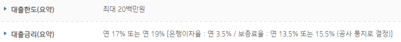 대출금리는 연 17% 또는 연 19%로 국민행복기금에서 금리를 결정하여 통보하며, 이 금리중 기업은행에 납부하는 이율은 3.5%, 나머지는 국민행복기금 보증료율로 책정되니 참고하시길 바랍니다.