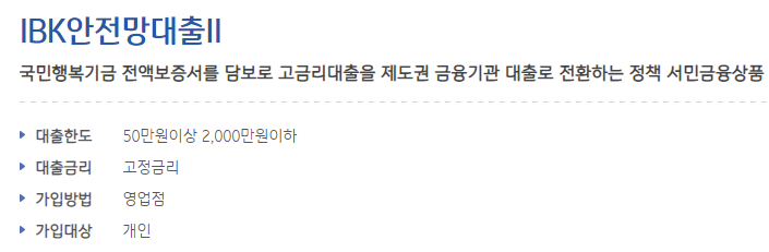 기업은행 안전망 대출은 연이율 20%를 초과하는 고금리 채무를 대환하는 용도로 최대 2000만원까지 지원하는 정부지원 서민 대환대출 상품입니다.