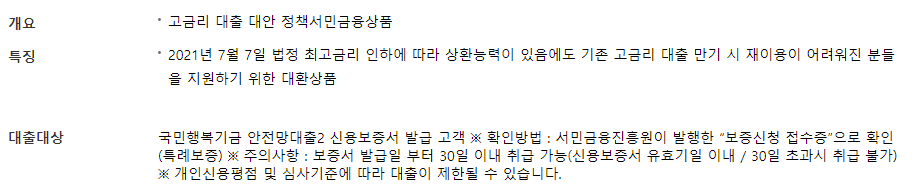 우리은행 안전망 대출은 2021년 7월 7일 법정 최고금리 인하에 따라 상환 능력이 있음에도 불구하고 기존 고금리 대출 만기시 재이용이 어려워진 분들을 지원하기 위한 정책 서민금융 상품입니다.
