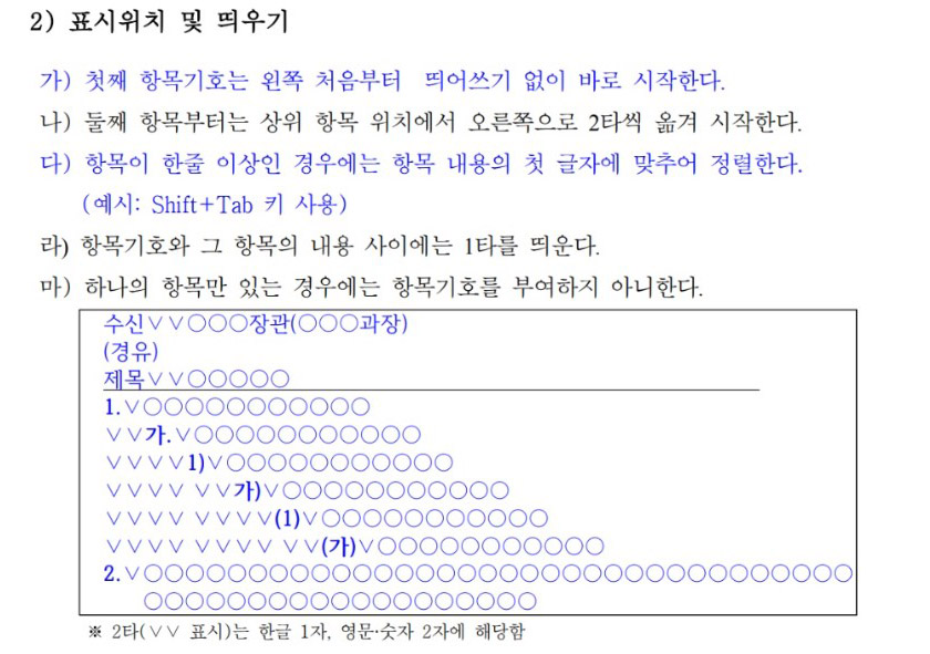 첫째 항목 기호는 왼쪽 처음부터 띄어쓰기 없이 바로 시작해야 합니다. 둘째 항목부터는 상위 항목보다 2칸씩 띄어놓고 시작합니다. 항목이 한 줄 이상이라면 항목 내용의 첫번째 글자에 맞춰 적습니다. 항목기호와 내용 사이에 한 칸을 띄어야 합니다. 드물게 하나의 항목 뿐이라면 항목기호는 적지 않습니다.