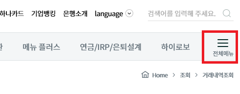 KEB하나은행 홈페이지에 접속한 후 우측 상단 "전체 메뉴"를 클릭합니다.
