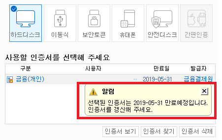 위 화면은 제가 사용하고 있는 개인 인증서인데, 보시는 것처럼 5월 31일 만료 예정일이라면서, 갱신을 하라는 알림이 나왔답니다. 그러면 어디에서 어떻게 하면 될까요?