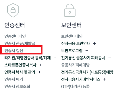 이어서, 인증센터 -> 인증서 갱신 메뉴를 클릭하여 이동합니다. 타 은행을 사용 중이라도 비슷한 "전체 메뉴" 보기 등을 통해 진행하실 수 있으며 절차는 비슷하오니, 참조만 하시길 바랍니다.