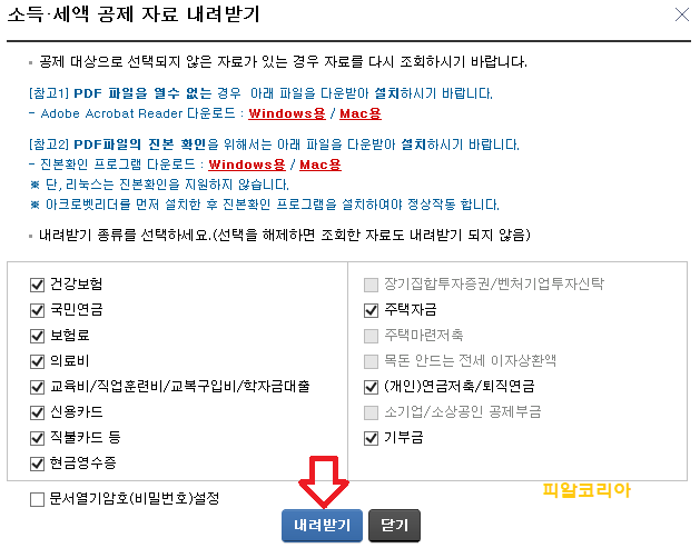 그리고, 각 항목별로 조회되는 값을 모두 제출하실 필요는 없습니다. 예를 들어 보험료의 경우 100만 원이 한도인데 모든 부양가족의 금액을 합해서 제출하실 필요는 없습니다. 위 화면과 같이 불필요한 항목 또는 금액을 체크 해지하시면 됩니다.