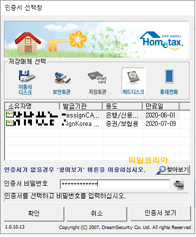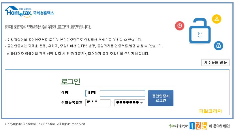 이용 방법은 간단합니다. 위 로그인 화면에서 성명과 주민등록번호를 입력 후 "공인인증서 로그인"을 클릭합니다.