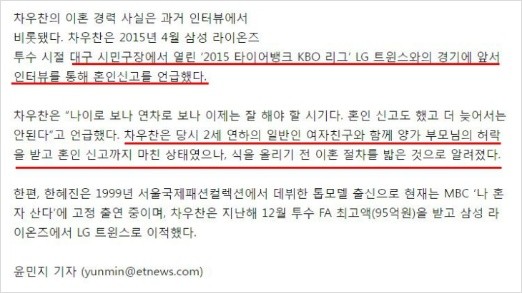 그럼에도 이런 얘기가 떠도는 이유는 모델 한혜진과 차우찬이 잠시 사귀면서 차우찬이 돌싱이라는 소문이 나돌았고, 2015년 4월 인터뷰 기사가 소환되어 논란이 되었기 때문입니다.