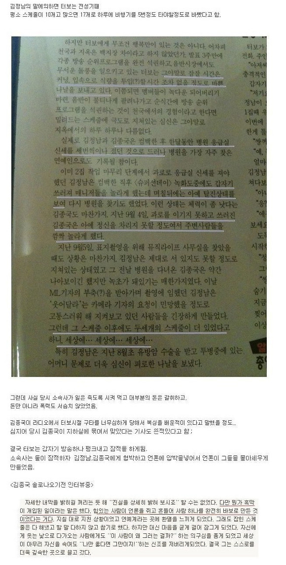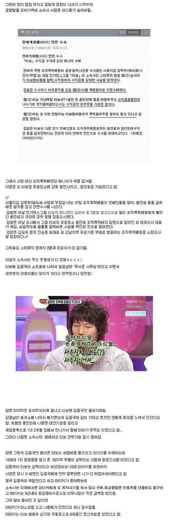 아래는 당시 김종국과 김정남이 당했던 사건들을 스크랩한 것인데, 연예계 조직폭력배로부터 얼마나 많이 시달렸는지를 잘 알 수 있습니다.
