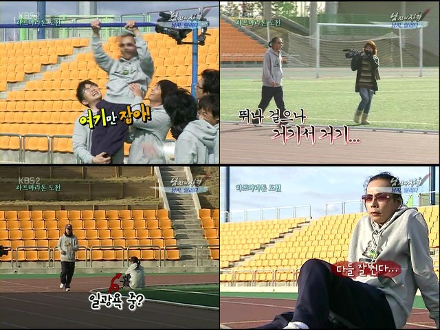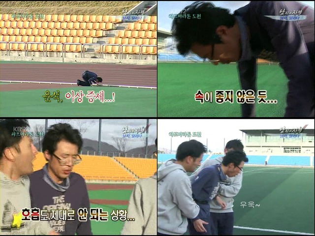 요즈음 들어 '남자의 자격'은 부쩍 멤버들의 체력이 필요한 아이템을 많이 채택하고 있습니다. '신입생 되기' 라든가 '아내가 사라졌다' 등의 경우는 별다른 체력을 필요로하지 않았으나, '전투기' 체험이라든가 이번 주의 '마라톤' 체험은 보기만해도 아찔하고 위험할 정도의 체력이 필요한 것이었습니다.