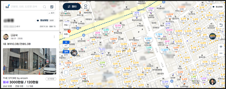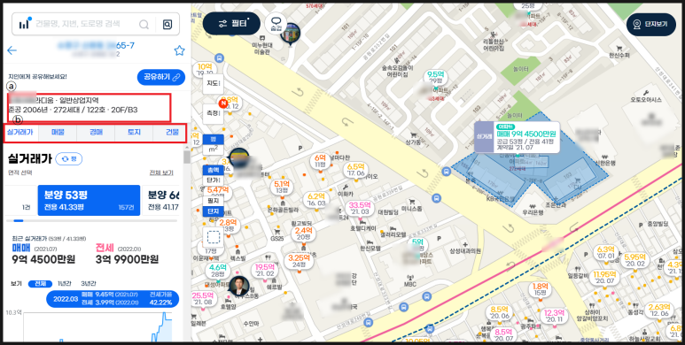 왼편에 현재 위치 정보와 검색창이 있고 오른 편에는 지도와 각 건물의 시세가 나옵니다. 대지지분을 구하고 싶은 아파트를 왼쪽의 검색창 또는 오른쪽의 지도를 이용해 선택합니다.
