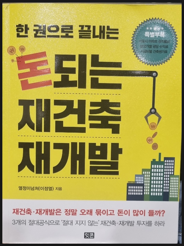 열정이 넘쳐 이정열 님이 지은 책으로 재건축과 재개발 공부를 하는 사람이라면 누구나 한 번쯤은 들어본 책입니다. '한 권으로 끝내는 돈 되는 재건축 재개발'이란 책은 총 2권까지 있으며 1권의 경우 재건축 분석, 2권의 경우 재개발 분석에 대해 다루었습니다. 1권을 참고하였습니다.