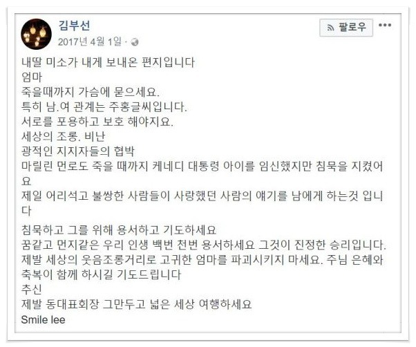 김부선이 지난해 자신의 페이스북에 "내 딸 미소가 보내온 편지입니다"라는 글과 함께 공개한 이미소의 손편지 내용이 눈길을 끌고있습니다.