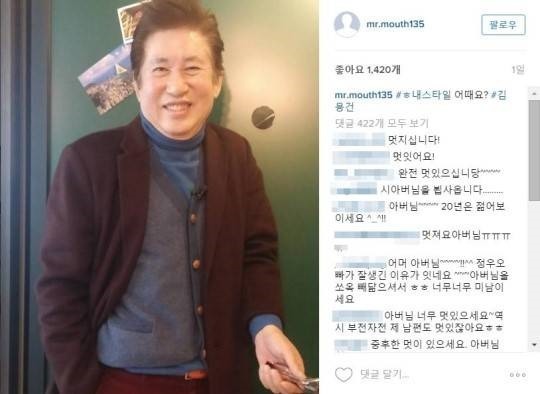 김용건은 하정우의 아버지로도 유명세를 떨치기도 하는데요. 덕분에 하정우의 미혼 여성팬들로부터 '국민 시아버지'라는 별명도 생겼습니다.