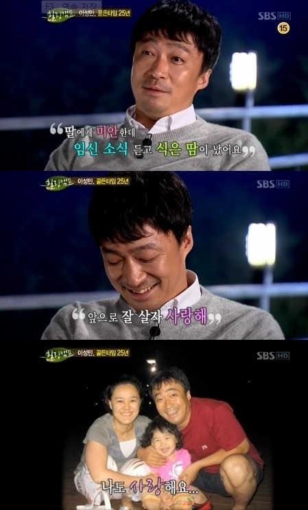 이성민: "결혼 후 당분간 아기는 갖지 말자고 했는데 허니문 베이비가 생겼다. 당시 신혼집 단칸방 보증금도 간신히 구한터라 딸에게 정말 미안하지만 임신 소식을 듣고 식은땀이 났다. 난생 처음 느낀 두려움이었다."