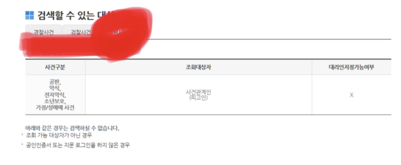 ㅇ. 검색할수 있는 대상으로 자신의 목록을 선택해서 보면 되는데요. 조회 대상자는 사건 관계인으로 피고인만 조회가 가능한것으로 보입니다. 그렇다면 자신의 공인인증서로 로그인을 한 후 확인을 해보세요.