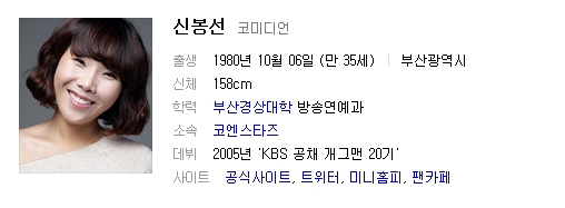 신봉선은 KBS 공채 20기 개그맨으로 간판프로그램인 개콘의 간판 여자 개그맨 이었습니다. 요즘에는 각종 프로그램에 게스트로 출연하며 활력을 넣는 감초역활을 톡톡히 하고 있는데요.
