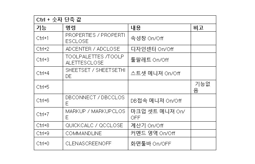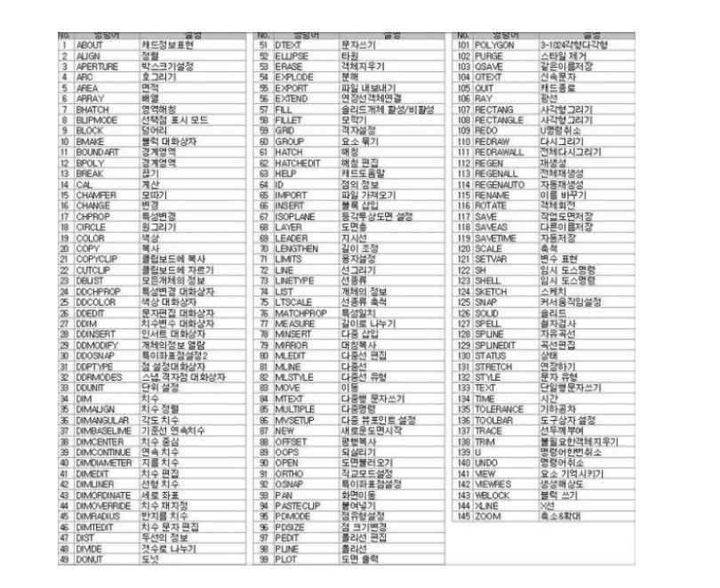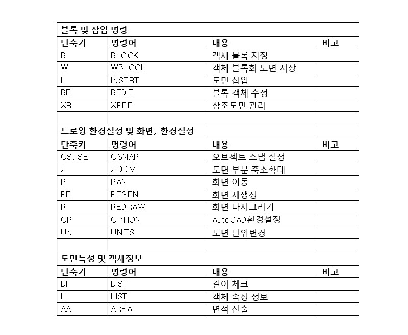 이 뿐만 아니라 오토캐드 명령어 모음으로 B 객체 블록지정, BE 블록 객체 수정, XR 참조도면 관리, I 도면 삽입, Z 도면 부분 축소확대, P 화면 이동, R 화면 다시 그리기, OP 오토캐드 환경설정, UN 도면 단위변경, DI 길이체크, LI 객체 속성 정보, AA 면적 산출 등으로 활용할 수 있습니다.