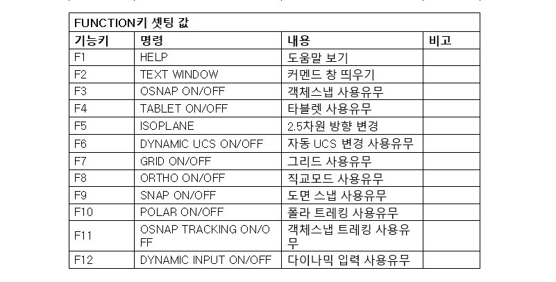 오토캐드 명령어 모음을 이용하는 것보다 단축키를 활용해서 작업을 하는 것이 수월한 경우도 있는데요. 바로 FUNCTION키 셋팅 값입니다. F1은 도움말, F2는 커멘트창 띄우기, F3은 객체스냅 사용유무, F5는 2.5차원 방향 변경, F7은 그리드 사용유무, F8은 직교모드 사용유무, F9는 도면 스냅 사용유무 등이 있습니다.