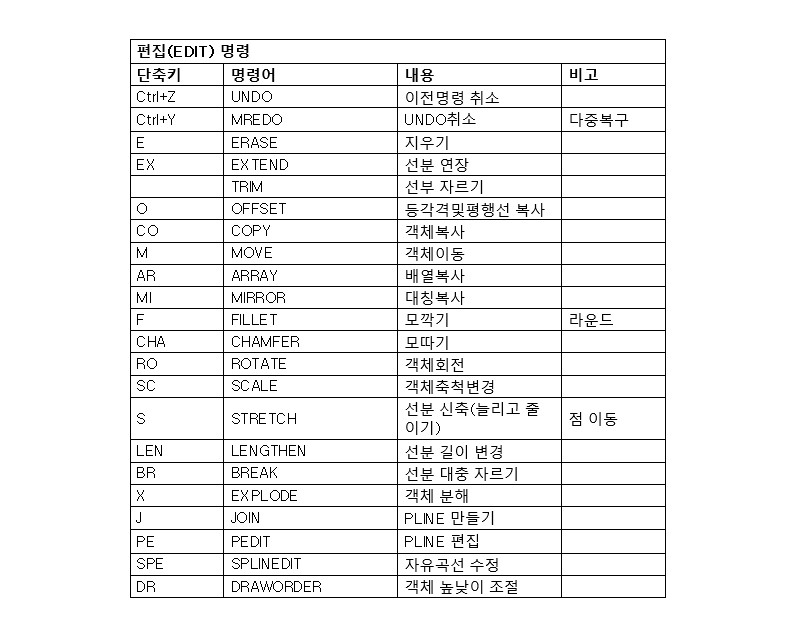 오토캐드 명령어 모음에서 자주 사용되는 단축키는 편집명령과 관련된 것입니다. 대표적으로 E 지우기, CO 객체 복사, M 객체 이동, RO 객체 회전, X 객체 분해 등 어떠한 선이나 도형을 그리고 이를 수정하거나 모양을 만들 때 주로 사용하는 단축키도 있습니다. 이 밖에도 Ctrl+Z 이전명령 취소 등도 자주 이용합니다.