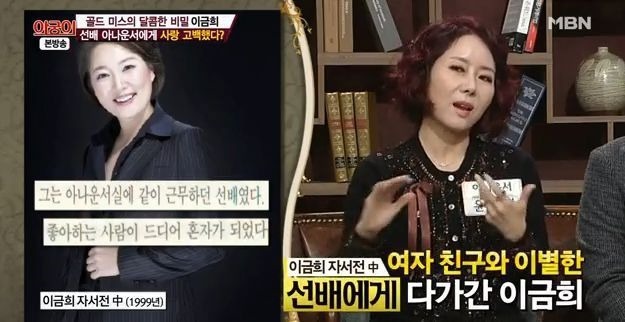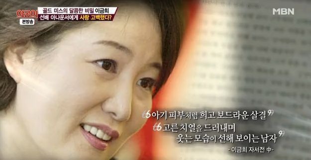 이금희 자서전에 언급된 '아기피부처럼 하얗고 보드라운 살결' '고른 치열을 드러내며 웃는 모습이 선해 보이는 남자'가 이금희가 아나운서 생활 당시 짝사랑했던 아나운서 선배의 모습이라고 하는데요. 이 남자 선배 아나운서는 미국에 유학중인 여자친구가 있었다고 합니다. 근데 어느순간 그 선배가 유학중이니 여자친구와 헤어지면서, 이금희는 이 짝사랑하던 선배와 2년간 연애를 하게 되는데요.