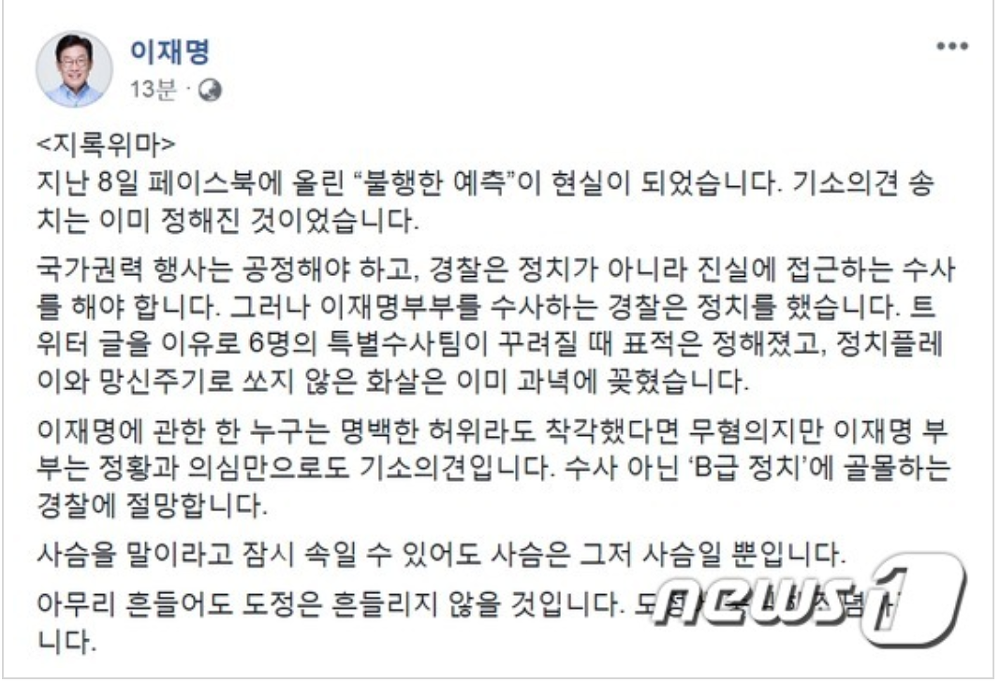 이에 이재명 경기도지사는 17일 부인 김혜경씨에 대한 경찰 수사결과 발표와 관련해 SNS에 '불행한 예측이 현실외 됐다"며 불편한 심경을 드러냈습니다.