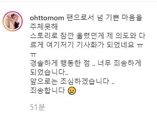 앞으로는 조심하겠다. 죄송하다"라고 게재했다.