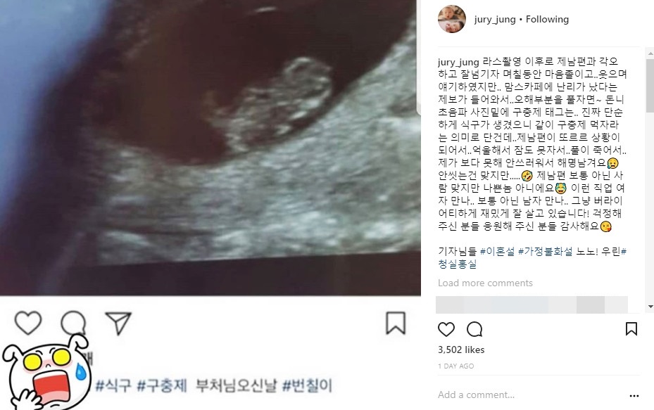 정주리 남편은 아이의 초음파로 보이는 사진에 "#식구 #구충제 부처님오신날 #번칠이"라는 글을 올렸고 아내 정주리와 자녀를 찍은 사진이 있는 다른 게시글에서도 "#대리기사 #정주리메니져 #교통사고 #외박은밥먹듯 #곧갈라설듯 #이혼조정기간 #룸싸롱 #혼외자 #이혼 #법원" 등 맥락없는 해시태그를 붙이기도 했습니다.
