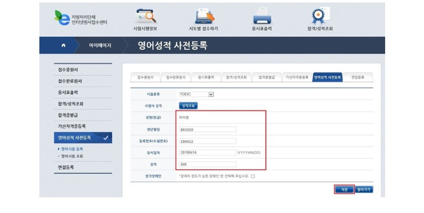토익, 텝스, G-TELP는 성적 조회 버튼을 눌러 해당 시험 사이트에서 성적을 가져오게 되어 있습니다. 이때 해당 시행사 사이트 로그인을 해야 합니다. 가져온 시험 정보를 저장하고 성적 등록을 누르면 됩니다. 토플은 입력 화면의 각 사항을 직접 입력하면 되는데 매월 1일~10일에만 등록할 수 있습니다.