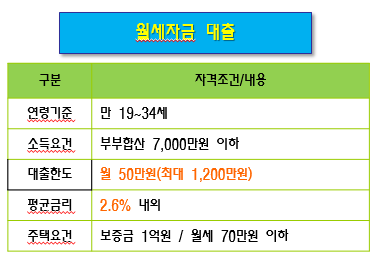 두 번째, 월세 자금의 경우 월 50만원 이내 최대 2년 동안 1,200만 원 한도로 지원 가능하며, 금리는 2.6%로 이용 가능합니다. 주택요건으로는 보증금 기준으로 수도권 5억 원, 월세 70만 원 이하의 계약만 해당이 됩니다.