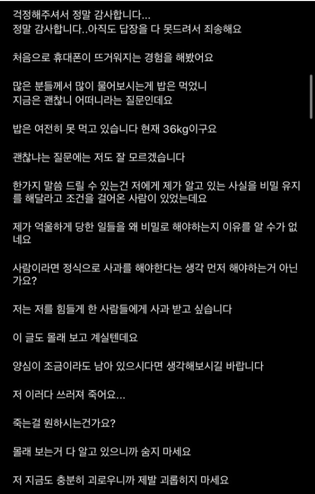 앞서 신민아는 지난 14일 자신의 인스타그램에도 글을 올려 “밥은 여전히 먹지 못해 현재 36kg입니다”라며 “괜찮냐는 질문에는 저도 잘 모르겠습니다”고 적었다. 이어 “저에게 제가 알고 있는 사실을 비밀 유지 해달라고 조건을 걸어온 사람이 있었는데요”라면서 “제가 억울하게 당한 일들을 왜 비밀로 해야하는지 이유를 알 수가 없네요”라고 불편한 심경을 드러냈다.