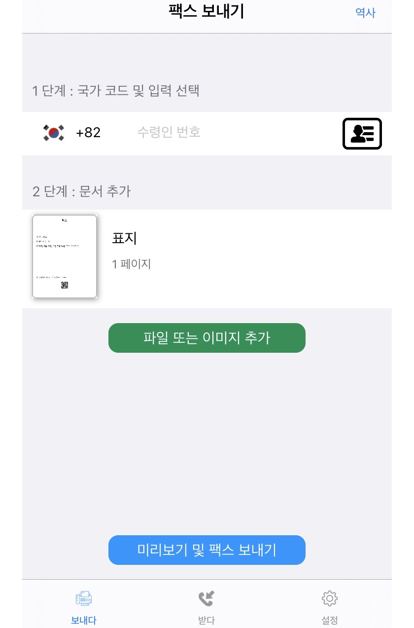 팩스 보내는법의 1단계는 우선 국가 코드 및 팩스 번호를 입력하는 것입니다. 물론 주소록에 팩스 번호가 있다면 이를 사용할 수도 있습니다. 그리고 문서를 추가하는데, 표지를 사용할 수 있어 편리합니다. 발신자 정보와 간단한 메세지를 적어 미리보기 후 첨부할 수 있습니다.