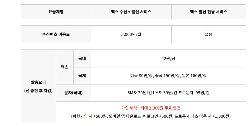 수발신이 가능하면 월 5천원의 수신번호 이용료가 있고 발신 전용은 없습니다. 발송 요금은 국내의 경우 장당 42원, 국제는 미국 장당 80원 수준입니다.