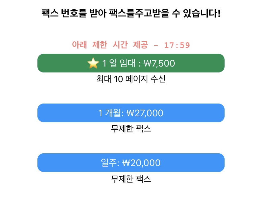 팩스 수신을 위해서는 팩스 번호를 받아야 합니다. 팩스 번호를 받는 것은 유료로 1일 임대시 최대 10페이지까지 수신이 가능하며 7,500원이고 1개월은 27,000원, 일주는 20,000원입니다. 대부분의 팩스 어플이 모두 무료는 아니고 무료로 몇 건을 제공하고 이후에는 과금을 하는 방식입니다.