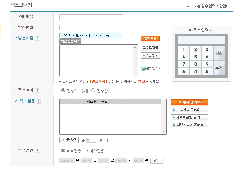 홈페이지에 팩스 보내는법에 대한 튜토리얼이 준비되어 있습니다. 간단히 설명드리면 팩스 보내기 클릭 후 받는 사람을 입력하고 pc에 저장된 스캔된 문서를 불러와 첨부하고 입력 확인 후 전송을 하면 됩니다.