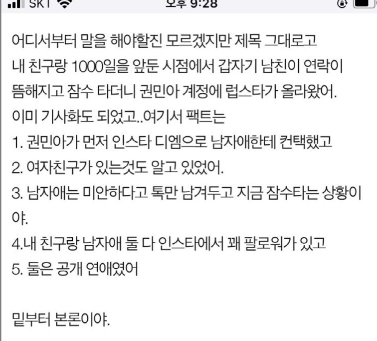 시작은 전 여친의 친구가 폭로 글을 올리면서....