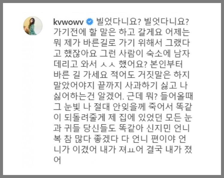 권민아는 4일 자신의 인스타그램에 "가기 전에 할 말은 하고 가야겠다. 어제는 내가 바른 길로 가기 위해 그랬다고 했다. 그런 사람이 숙소에 남자 데리고 와서 성관계를 가졌냐"고 했다. 이어 "적어도 거짓말은 하지 마라. 끝까지 사과하기 싫고 나 싫어하는 건 알겠다. 들어올 때 그 눈빛 절대 잊지 못한다"며 "죽어서 똑같이 되돌려주겠다. 집에 있던 모든 눈과 귀들 당신들도 모두 똑같다"고 덧붙었다.